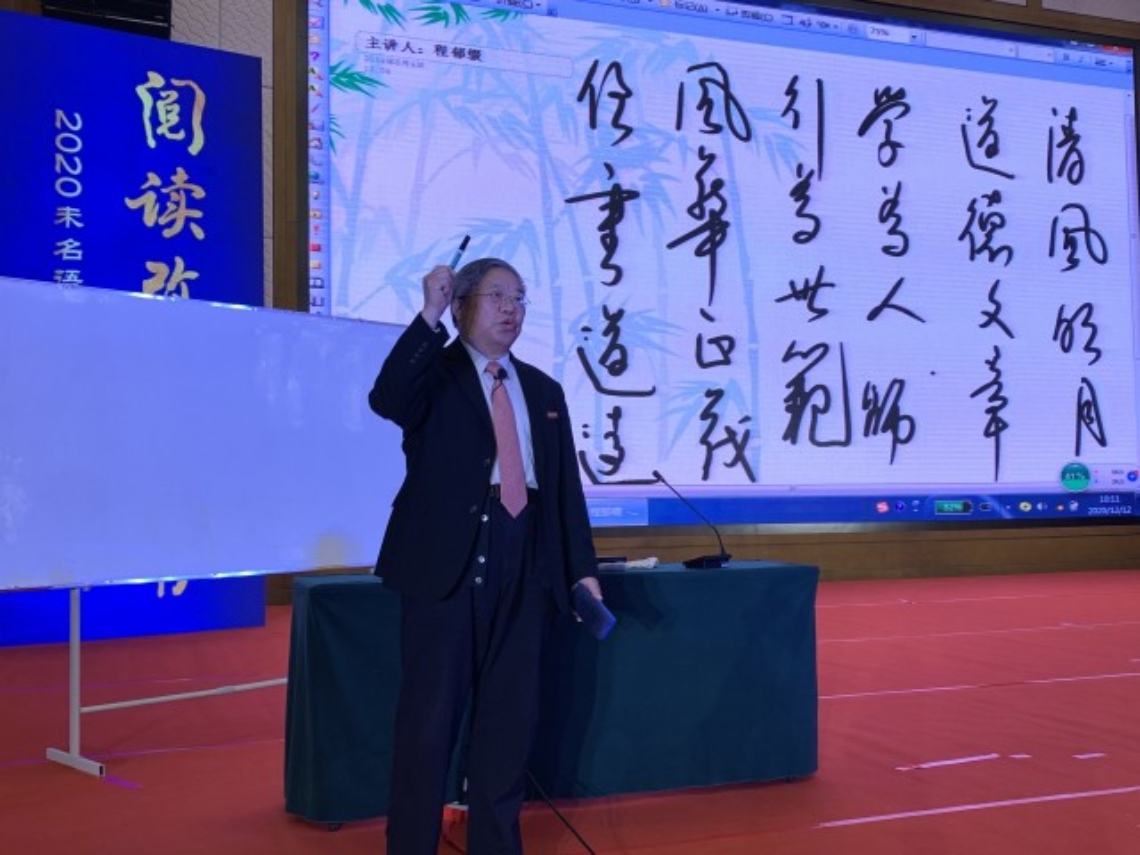 程郁缀教授在其《古典诗歌与人文精神》报告中,从《诗经》《楚辞》的现实主义和浪漫主义传统发端,讲到建安风骨、六朝绮丽、唐宋风流,追溯中国古代诗歌的恒常主题,剖析中华文化的优秀基因。《国风》的批判精神、《孟子》的“民贵君轻”、屈原的高洁独立、曹操的襟怀抱负、陶渊明的田园留恋、杜甫的圣人境界,都在他的讲述中生动可感,让听众感受到强烈的心灵震撼。程教授保持了课堂板书的习惯,引用的诗句都以书写呈现,规整美观的板书、流畅大气的书法让人赞叹,整场讲座充满古典的气韵和美感。