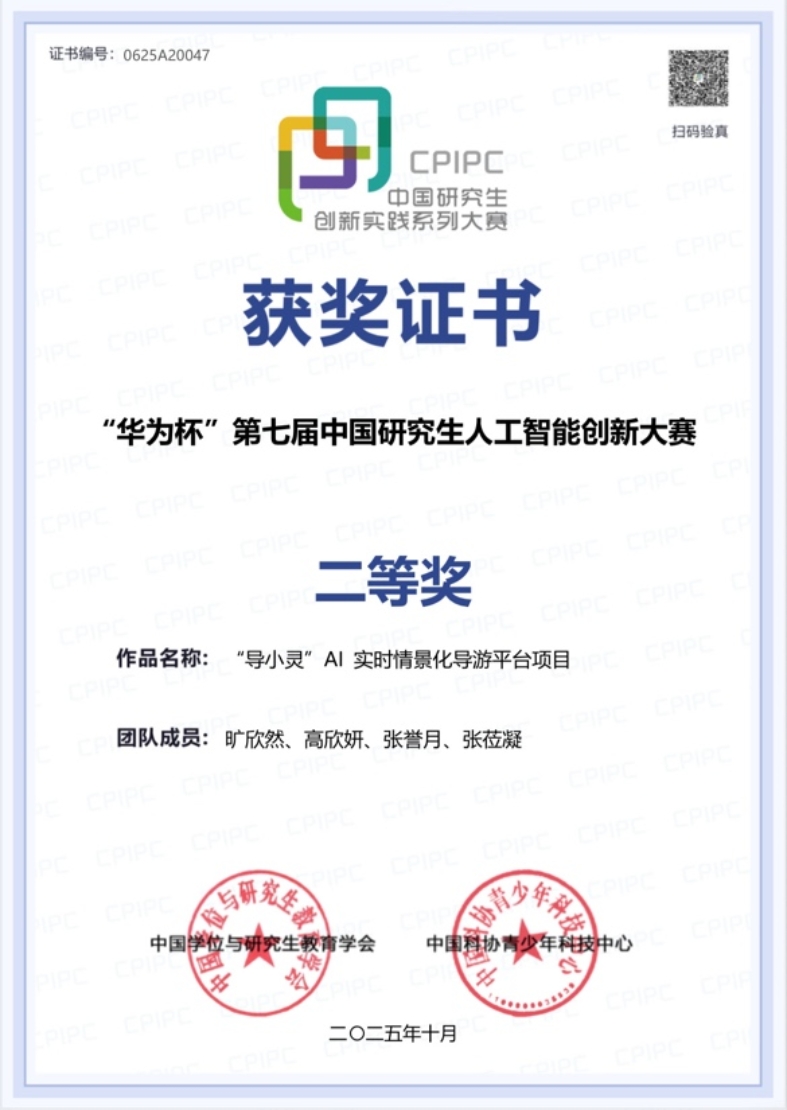 近日,于山东青岛举办的“华为杯”第七届中国研究生人工智能创新大赛全国总决赛圆满落幕。由北京大学教育学院教育技术系贾积有教授课题组与汪琼教授课题组学生旷欣然、高欣妍、张誉月、张莅凝组成的参赛团队,凭借作品《“导小灵”AI实时情景化导游平台》荣获全国二等奖。该团队也是本届大赛中北京大学唯一一支入选全国总决赛并获奖的队伍。