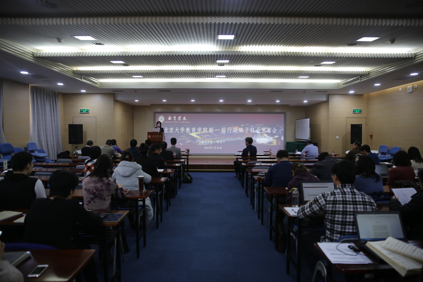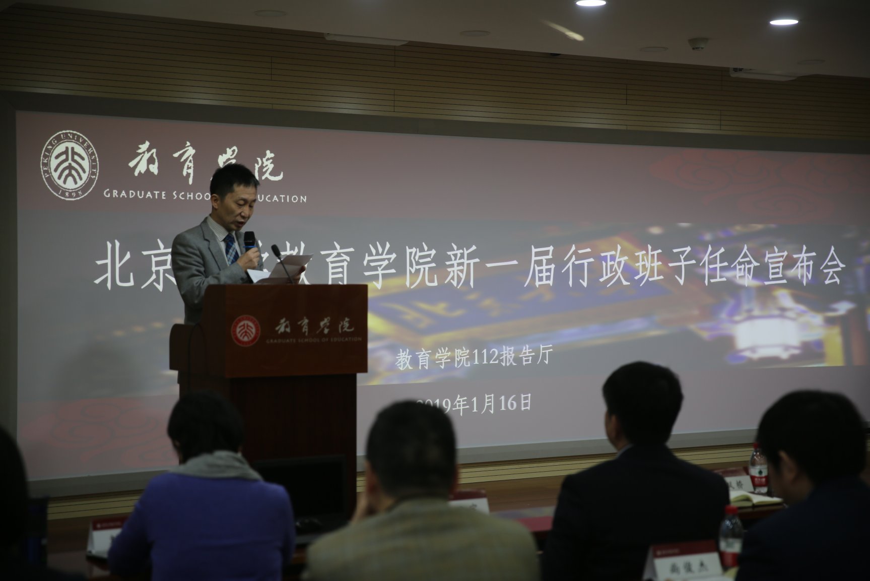 2019年1月16日上午,北京大学教育学院行政班子换届宣布会在教育学院报告厅顺利召开。北京大学副校长王博、校党委组织部常务副部长霍晓丹、教育学院新老行政领导班子成员和在职教职员工参加了宣布会,会议由霍晓丹主持。