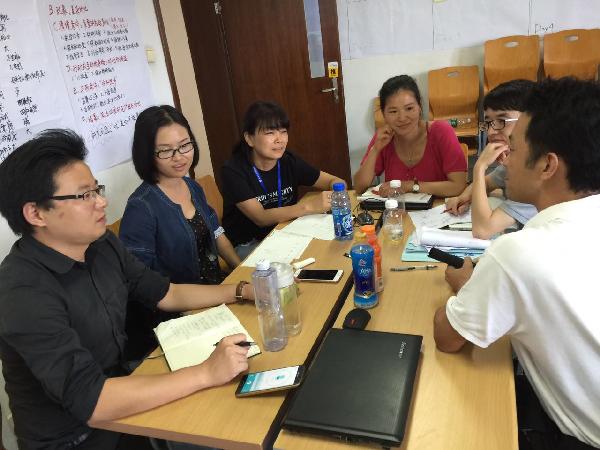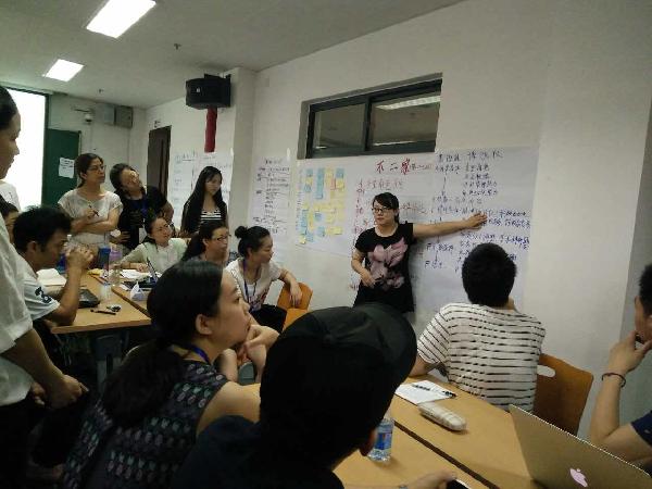 第二,采用小组合作学习方式。42名学员按照研究主题分成8个小组,在上午的课程教学中,教师会抛出问题,提供理论指导和研究案例,指定任务,组织小组讨论。在下午的自主学习时间中,同小组成员一起推进对问题的理解,并可以随时与助教讨论相关疑惑。根据教学需要,在上午的授课中,教师还会重新对学员进行分组,以促进不同学员之间的交流。学员们对这一学习方式印象深刻,有学员感慨道:“第一次经历这么彻底的小组合作学习,学习的控制权几乎让渡给了学员。正是小组成员们的分享,激发了我未曾发现的自我潜力,太过瘾了!”还有学员在第六天的豆瓣跟帖中写道:“我们小组的合作和讨论也日渐进入默契和完美的阶段,我们似乎已经能够通过对话而真正理解彼此的观点,并通过讨论进行扬弃。快乐学习,在学习中体验快乐,真的没有比这更开心的了。”