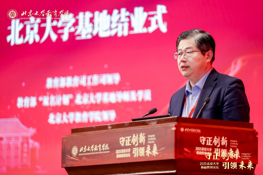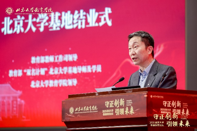 北京大学基地导师代表、北京大学基地总负责人阎凤桥教授回顾了三年培养历程,对校长们的办学成就给予高度评价,肯定了各位校长把世界作为课堂的学习和实践过程。他同时反思了培养过程中的不足,希望未来能将办学经验转化为研究素材,并推动国优计划学生社会实践。针对当前基础教育面临的学生心理问题、网络沉迷、AI 冲击等挑战,他鼓励校长们持续探索,为素质教育转型贡献力量。