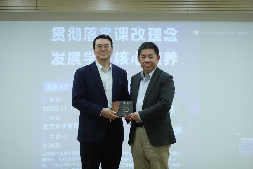 2025年11月13日,北京大学“国优计划”科学教育讲坛2025年第2期在教育学院112报告厅举行。人民教育出版社副总编辑、编审李海东受邀进行了讲座,主题为“贯彻落实课改理念,发展学生核心素养”。本次讲座由北京大学教育学院“国优计划”工作组副组长、助理教授郑蕾主持,教育学院副院长尚俊杰、两届“国优计划”研究生以及关注科学教育的校内外师生和媒体记者参与,共同探讨新时代基础教育课程改革下数学和理科教材的建设路径。